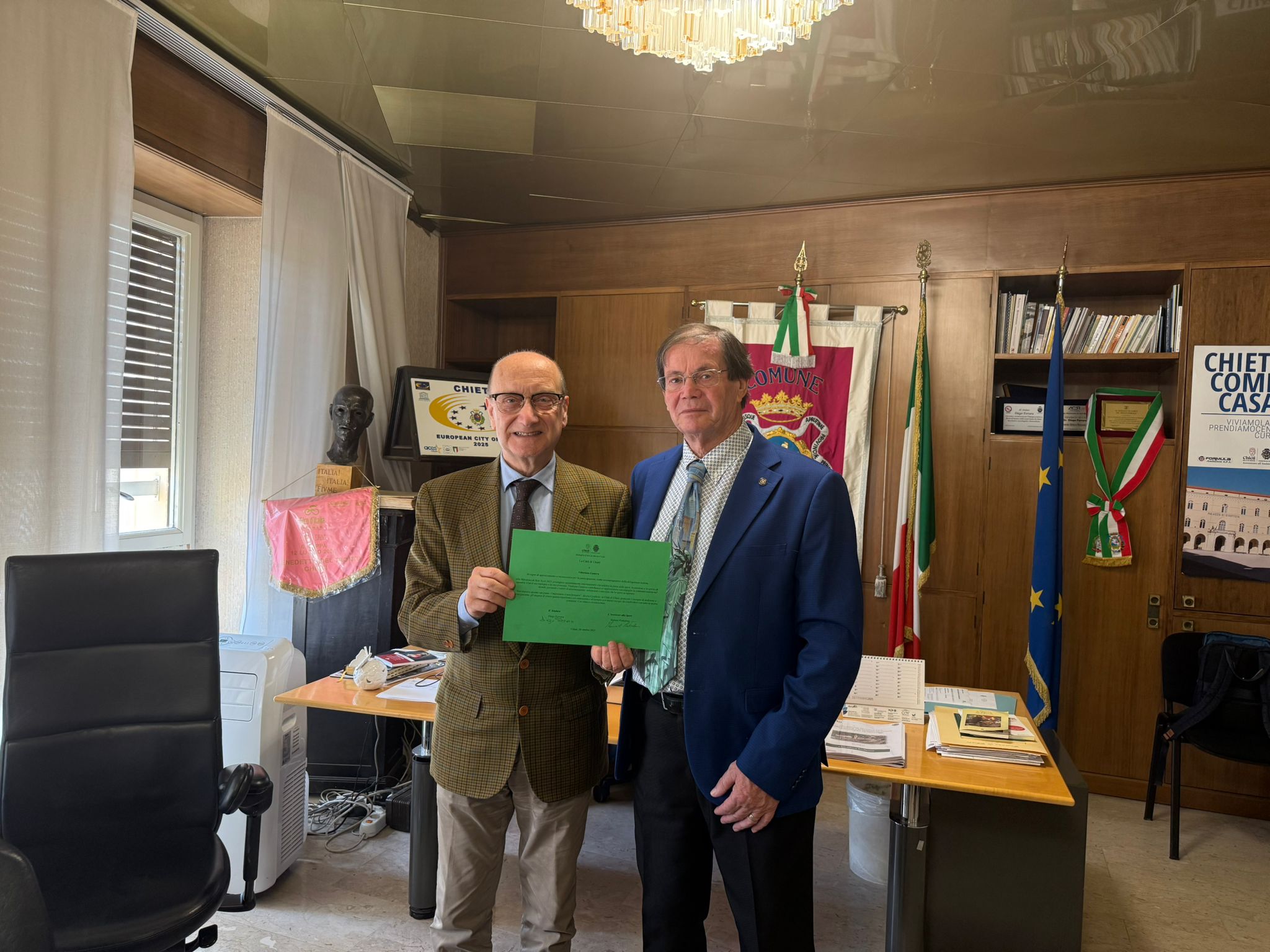 Stamane, a Palazzo di Città, il sindaco Diego Ferrara e il consigliere comunale Aldo Grifone lo hanno ricevuto per consegnargli una pergamena istituzionale di buon viaggio, riconoscimento simbolico per una carriera sportiva e umana che da anni dà lustro a Chieti.
