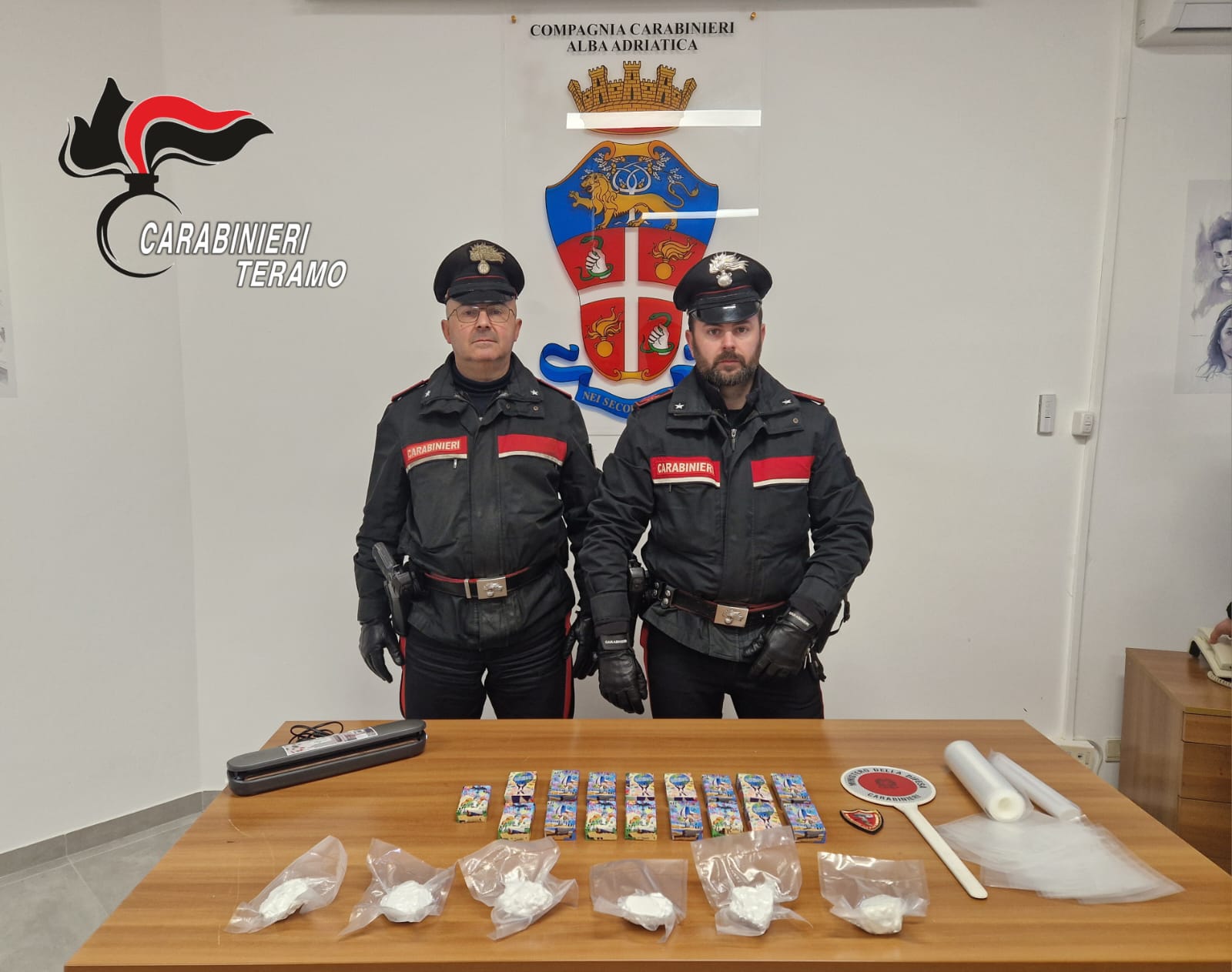 La fuga è durata poco: l’uomo è stato intercettato a Corropoli, dove ha tentato di sottrarsi all’arresto prima di essere definitivamente bloccato. La successiva perquisizione nella sua abitazione ha permesso di rinvenire 17 panetti di hashish per un peso di circa 1,8 chili, 5 involucri di cocaina per un totale di 267 grammi, e diverso materiale utilizzato per il confezionamento delle dosi.