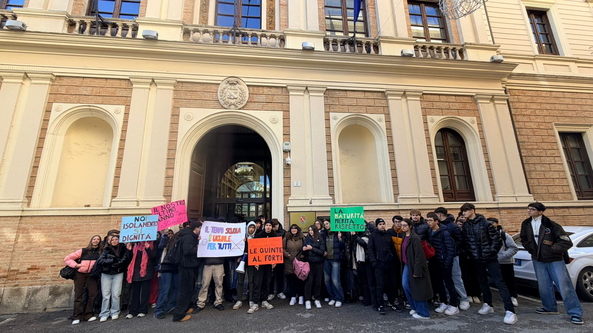 TERAMO – Mattinata di protesta per gli studenti del liceo Delfico ospitati nell’istituto Pascal, che si sono ritrovati a fare lezione con i termosifoni spenti. Dopo uno sciopero spontaneo nei corridoi, una delegazione di rappresentanti di istituto si è spostata sotto il palazzo della Provincia di Teramo, in via Milli, per chiedere un confronto diretto con il presidente Camillo D’Angelo.