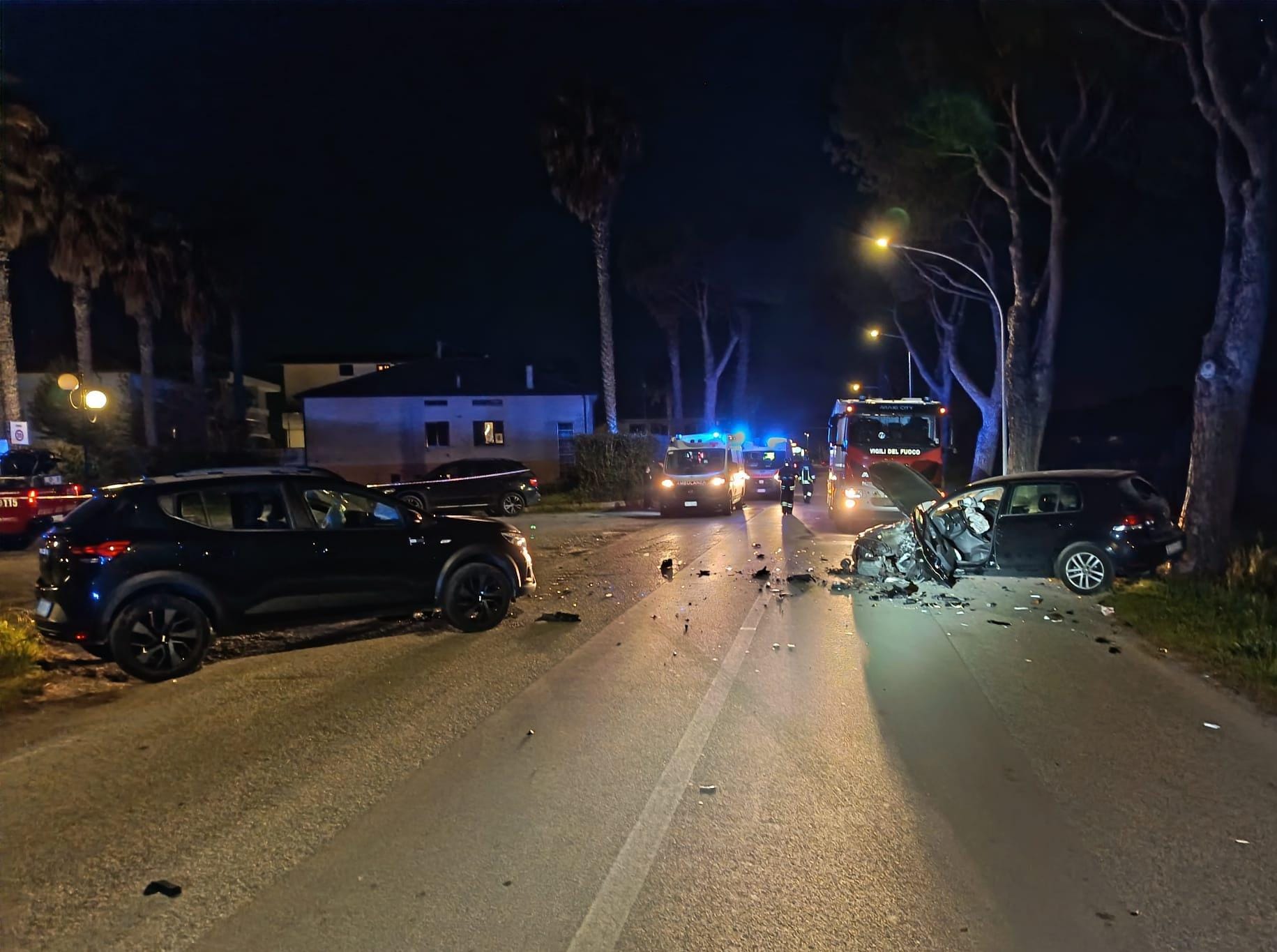 Il primo intervento è scattato intorno alle 20:45 a Villa Rosa di Martinsicuro, all’incrocio tra via Roma e via Positano, dove si sono scontrate una Dacia Sandero e una Volkswagen Golf. Nell’impatto sono rimasti feriti i due conducenti: un 53enne residente a Martinsicuro, alla guida della Golf, e un cittadino belga di 46 anni alla guida della Sandero. I vigili del fuoco hanno collaborato con il personale del 118 di Giulianova per prestare soccorso e i due sono stati trasportati in ospedale con altrettante ambulanze. Sul posto anche i carabinieri di Martinsicuro per i rilievi e la gestione del traffico.